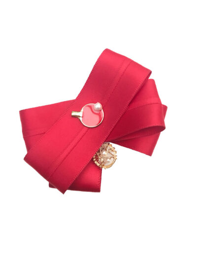 Blaszka z tyłu broszki z mosiądzu galwanizowanego 24 karatowym złotem twardym. Zapięcie z metalu z zabezpieczeniem. Podkładka pod blaszkę – filc w kolorze fuksji. Broszka szyta bawełniano-elastycznymi nićmi oraz klejona klejem winylowym. Wstążka satynowa dwustronna. Element środkowy i zawieszka to tzw. biżuteria modowa.